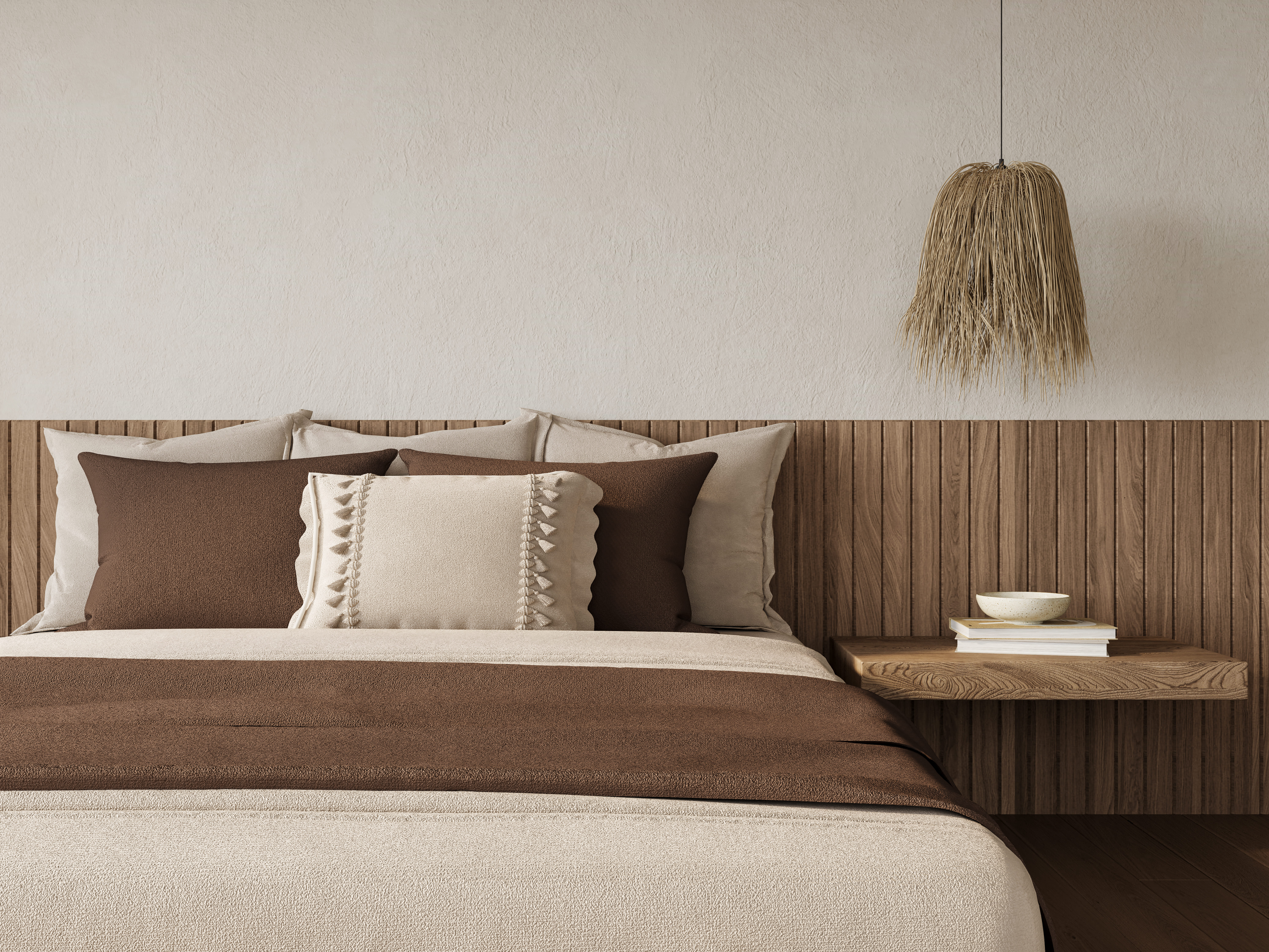 Dacă ai lenjerii de pat maro, încearcă să păstrezi pereții într-o nuanță neutră (alb-murdar sau bej) și adaugă perne decorative în culori contrastante, cum ar fi turcoazul sau galbenul muștar.