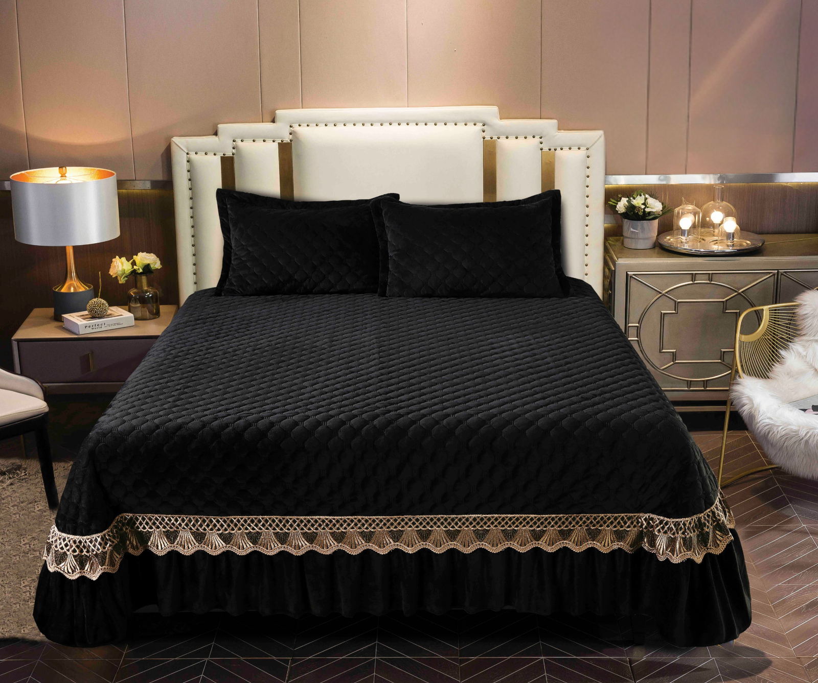 Descoperă luxul și eleganța cu această cuvertură din catifea cu dantelă și broderie de cea mai bună calitate, perfectă pentru a adăuga un strop de rafinament și stil în dormitorul tău. Cuvertura de pat este realizată cu atenție la detalii și este potrivită pentru a crea un aspect deosebit în orice cameră.