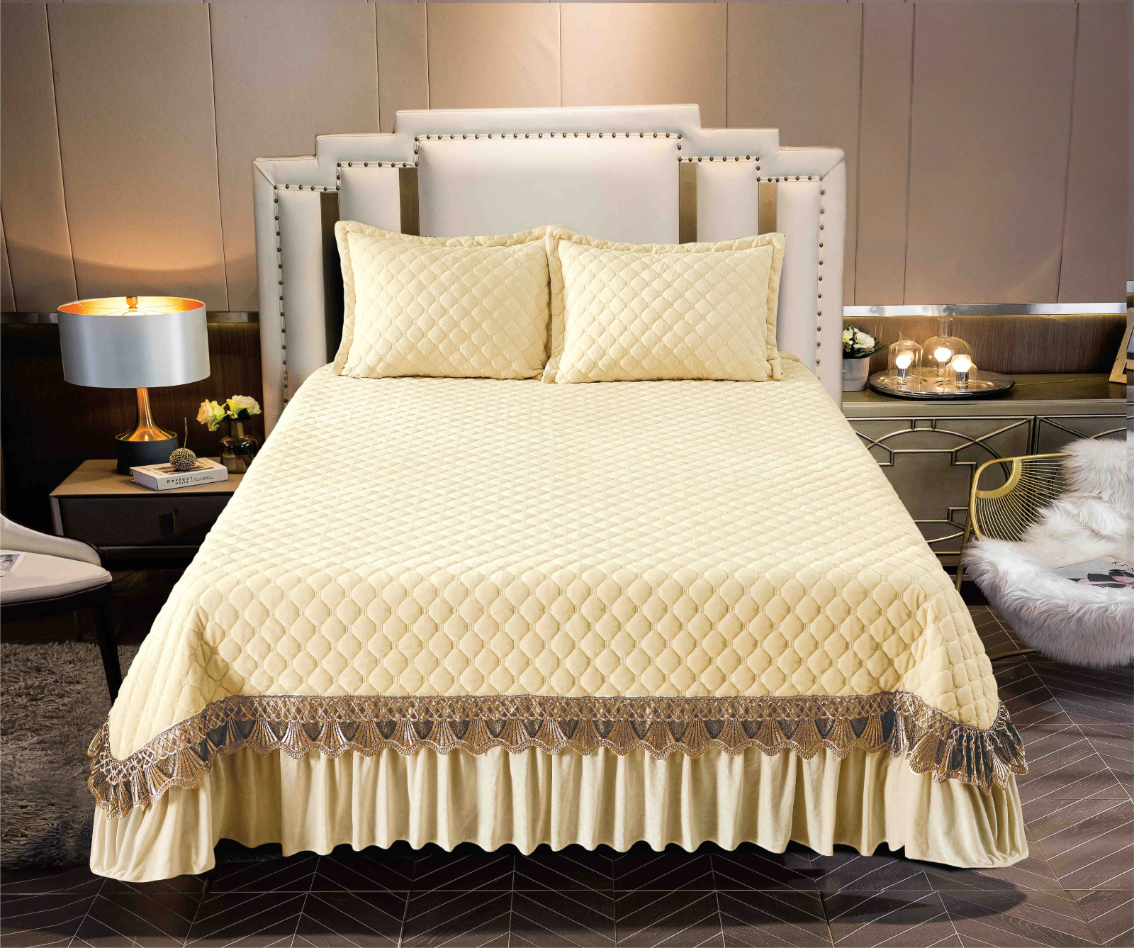 Descoperă luxul și eleganța cu această cuvertură din catifea cu dantelă și broderie de cea mai bună calitate, perfectă pentru a adăuga un strop de rafinament și stil în dormitorul tău. Cuvertura de pat este realizată cu atenție la detalii și este potrivită pentru a crea un aspect deosebit în orice cameră.