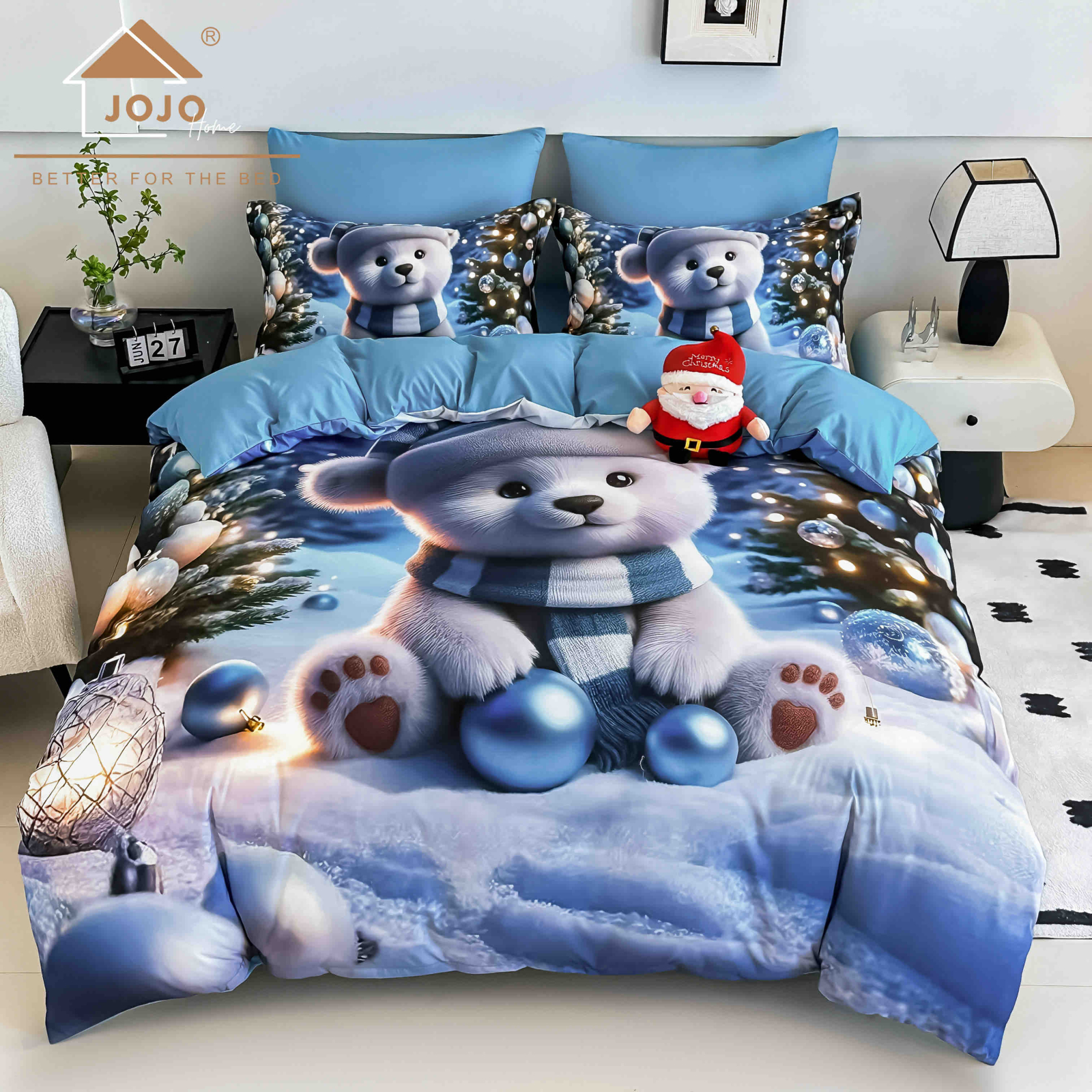JOJO HOME Lenjerie de Pat Craciun, Imprimeu 5D , Pat Dublu, Cearsaf cu Elastic