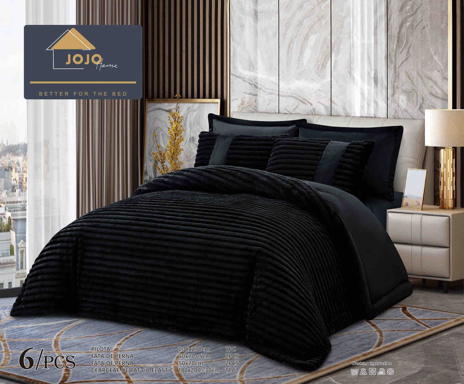 Lenjerie de pat cu Pilota Inclusa, Cearceaf cu Elastic, 6 Piese, Blana de Iepure Artificiala si Catifea, Negru